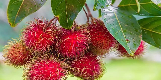 ரம்புட்டான் பழங்கள் மஞ்சள் மற்றும் சிவப்பு என இரண்டு நிறங்களில் காய்க்கும். ரப்பர் போன்ற மிருதுவான முள்களுடன் தோற்றமளிக்கும் ரம்புட்டான் பழங்களை லேசாக விரல்களால் அழுத்தி உடைத்தால் உள்ளே விதையுடன் முட்டை போன்று இருக்கும் சதைப்பகுதியை உண்ணலாம். லேசான புளிப்பு கலந்த இனிப்புச் சுவை கொண்டதாக இருக்கும்.