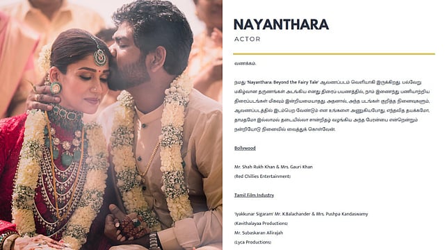 இதில், நடிகர் தனுஷ் பெயர் இடம்பெறாதது குறிப்பிடத்தக்கது. கடைசியாக, “நம் பயணம் என்றென்றும் தொடரும்; பெருமகிழ்வுடன் நயன்தாரா” என அந்த அறிக்கை முடிக்கப்பட்டுள்ளது.