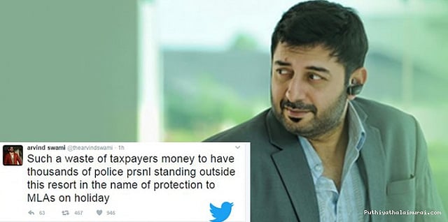 அதிமுக பொதுச்செயலாளர் சசிகலாவுக்கு ஆதரவு தெரிவித்து அதிமுக சட்டமன்ற உறுப்பினர்கள் கூவத்தூரில் உள்ள தனியார் விடுதியில் தங்கியுள்ளனர். இதுகுறித்து தனது ட்விட்டரில் பதிவிட்டுள்ள நடிகர் அரவிந்த் சாமி, தனியார் விடுதியில் பொழுதை களிக்கும் சட்டமன்ற உறுப்பினர்களுக்கு பாதுகாப்பு அளிக்க ஏராளமான காவல்துறையினர் விடுதியின் முன்பு பாதுகாப்புக்கு குவிக்கப்பட்டுள்ளனர். இதன் மூலம் மக்களின் வரிப்பணம் வீணாகிறது என பதிவிட்டுள்ளார்.