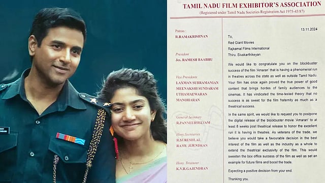 இது குறித்து அறிக்கை வெளியிட்டுள்ள தமிழ்நாடு திரையரங்கு உரிமையாளர்கள் சங்கத்தின் பொது செயலாளர் ஆர் பன்னீர்செல்வம், “அமரன் திரைப்படம் அனைத்து திரையரங்குகளிலும் வெற்றிகரமாக ஓடிக்கொண்டிருப்பதால் அதன் ஓடிடி வெளியீட்டை தள்ளி வைக்க வேண்டும்” என்று கூறியுள்ளார்.