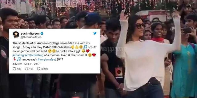 முன்னாள் பிரபஞ்ச அழகி சுஸ்மிதா சென், மும்பை செயிண்ட் ஆண்ட்ரூஸ் கல்லூரியிக்கு சென்றிருந்தார். அங்கே குழுமியிருந்த மாணவ, மாணவிகள் இவரை நடனமாடச் சொன்னார்கள். மாணவர்களின் வேண்டுகோளுக்கு இணங்க, அவர்களுடன் சுஸ்மிதா அழகாக நடனமாடினார். இதனால் உற்சாகமடைந்த மாணவர்கள், விசிலடித்து சுஸ்மிதாவுடன் நடனமாடி மகிழ்ந்தனர். இந்தச் சம்பவத்தை சுஸ்மிதா சென் தனது ட்விட்டர் பக்கத்தில் வீடியோவுடன் பதிவு செய்துள்ளார். அந்த வீடியோ சமூக வலைதளங்களில் வைரலாகி வருகிறது.