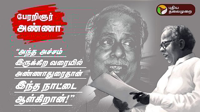 ஆனால், ஆட்சியைக் கலைத்துவிட்டு வேறோருவர் இங்கு வந்து உட்கார்ந்து, அண்ணாதுரை கொண்டுவந்தவற்றை எல்லாம் மாற்ற வேண்டும் என்று எண்ணும்போதே, ‘மக்கள் வெகுண்டெழுவார்களே’ என்ற அச்சமும் கூடவே வருமில்லையா... அந்த அச்சம் இருக்கிற வரையில், இங்கே யார் ஆண்டாலும், அண்ணாதுரைதான் இந்த நாட்டை ஆள்கிறான் என்று பொருள்!”