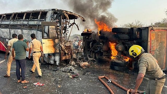 தெலங்கானாவின் நிர்மலில் இருந்து ஆந்திர மாநிலம் ஹரிகிருஷ்ணா டிராவல்ஸுக்குச் சொந்தமான சொகுசுப் பேருந்து ஒன்று இன்று ஆந்திர மாநிலம் நெல்லூரை நோக்கிச் சென்றுகொண்டிருந்தது. மார்காபுரம் மாவட்டம் ராயபுரம் கல்குவாரிகள் அருகே அப்பேருந்து சென்று கொண்டிருந்தபோது டிப்பர் லாரி மீது மோதி விபத்துக்குள்ளானது. இதில் பேருந்து தீப்பிடித்து எரிந்தது. பேருந்து தீப்பிடித்து எரிவதை அறிந்த பயணிகள் சிலர் பேருந்து கண்ணாடிகளை உடைத்துக் கொண்டு வெளியே குதித்து உயிர்தப்பிய நிலையில், 13 பேர் உயிருடன் பேருந்து தீயில் சிக்கி பலியாகினர். காயமடைந்த சுமார் 20 பயணிகள் அருகிலுள்ள மருத்துவமனைகளுக்கு அனுப்பப்பட்டு அங்கு சிகிச்சை பெற்று வருகின்றனர். உயிரிழந்தவர்களின் குடும்பங்களுக்கு தனது இரங்கலைத் தெரிவித்துள்ள பிரதமர் மோடி, நிதியுதவியையும் அறிவித்துள்ளார்; உயிரிழந்தவர்களின் குடும்பத்தினருக்கு தலா ரூ. 2 லட்சமும், காயமடைந்தவர்களுக்கு தலா ரூ. 50,000-மும் வழங்கப்படும் என்று அவர் அறிவித்தார்.