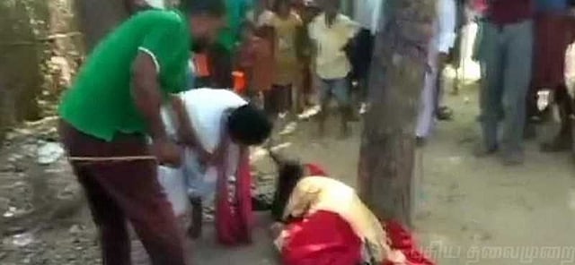 இதனிடையே வேறு சாதியை சேர்ந்த ஒருவருடன் சென்ற காரணத்தினால் ஊர் பஞ்சாயத்தை சேர்ந்த உறுப்பினர்கள், பொதுமக்கள் முன்னிலையில் மரத்தில் கட்டி வைத்து அப்பெண்ணை அடித்து துவைத்துள்ளனர். அப்பெண் அரைகுறை நினைவிற்கு செல்லும் வகையில் அடித்துள்ளனர். முடியை பிடித்தும் தரையில் தரதரவென இழுத்துள்ளனர். இதனை சுற்றி நிற்கும் சிறுவர்கள், பெரியவர்கள், பெண்கள் என அனைவரும் வேடிக்கை பார்த்துள்ளனர். யாரும் அப்பெண்ணுக்கு உதவ முன்வரவில்லை.