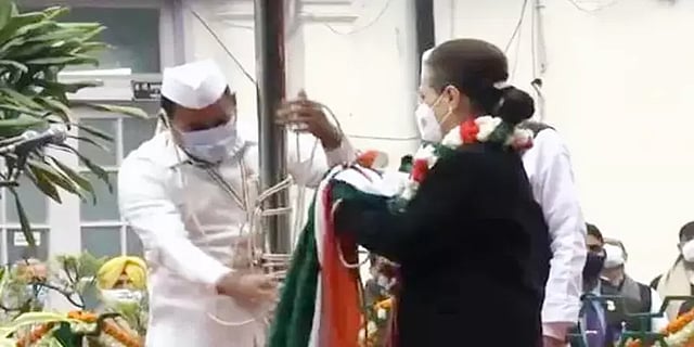 காங்கிரஸ் கட்சி விழாவின் போது கட்சி கொடியை சோனியா காந்தி ஏற்றியபோது கொடி கீழே விழுந்ததால் பரபரப்பு ஏற்பட்டது.