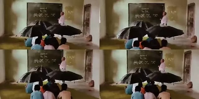மத்தியப் பிரதேசத்தில் உள்ள அரசுப்பள்ளி ஒன்றில் மேற்கூரை சேதமடைந்ததன் காரணமாக வகுப்பறைக்குள் மழைநீர் கசிவதால், குடை பிடித்தபடி மாணவர்கள் பாடம் கவனிக்கும் காட்சி சமூக வலைதளங்களில் வெளியாகி வைரலாக பரவி வருகிறது.