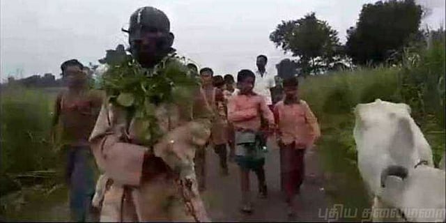 இதையடுத்து அந்தக் கும்பல் சரமாரியாக அந்த முதியவரை தாக்கியுள்ளது. பின்னர் அவருக்கு மொட்டையடித்து,கறுப்புச் சாயம் பூசி, சங்கிலியால் கட்டி தெருத்தெருவாக அந்தக் கும்பல் இழுத்துச் சென்றுள்ளது. இதற்கிடையே அந்த முதியவர் தான் ஒரு பிராமணர் சமுதாயத்தை சேர்ந்தவர், அதனால் பசுவை இறைச்சிக்கு விற்கமாட்டேன். நான் மருத்துவரிடம் அழைத்துச்செல்கிறேன் எனக்கூறியுள்ளார். அவர் கூறியது எதையும் காதில் வாங்காத அந்தக் கும்பல் தொடர்ந்து தாக்குதலில் ஈடுபட்டுள்ளது. இதில் கை உடைந்த அவர் தற்போது மருத்துவமனையில் அனுமதிக்கப்பட்டுள்ளார். தாக்குதலில் ஈடுபட்ட 4 பேரை காவல்துறையினர் கைது செய்துள்ளனர். அவர்கள் 4 பேரும் உத்தரப்பிரதேச முதலமைச்சர் யோகி ஆதித்யநாத் ஆரம்பித்த இந்து யுவ வாஹினியை சேர்ந்தவர்கள் என்பது தெரியவந்துள்ளது.