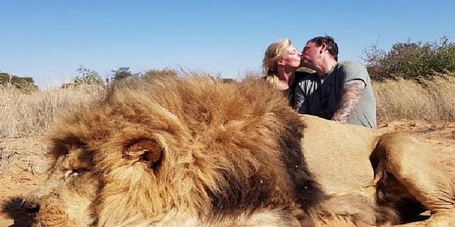 கனடாவின் எட்மாண்டன் பகுதியைச் சேர்ந்த தம்பதியான டரேன் மற்றும் கரோலின் கார்டர் ஆகியோர் தெற்கு ஆப்பிரிக்காவிற்கு சுற்றுலா சென்றுள்ளனர். அவர்கள் மிகப்பெரிய சிங்கம் ஒன்றை பொழுதுபோக்குக்காக வேட்டையாடியுள்ளனர். அதன்பிறகு சிங்கத்தின் உடல் அருகே அமர்ந்துகொண்டு கணவனும் மனைவியும் முத்தமிட்டுக்கொள்வது போல புகைப்படம் எடுத்து தங்களது சமூக வலைதளங்களில் பகிர்ந்துள்ளனர். அவர்களின் புகைப்படங்களை பகிர்ந்த சுற்றுலா ஏற்பாட்டாளர் ''கலாஹரி பாலைவனத்தில் கடின உழைப்பு. மிகப்பெரிய சிங்கம்'' என பதிவிட்டுள்ளார்.
