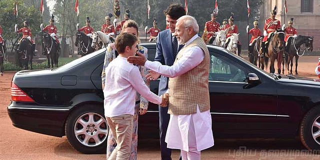 குடியரசுத் தலைவர் மாளிகையில் கனடா பிரதமர் ஜஸ்டின் ட்ரூடோவுக்கு சிவப்புக் கம்பள வரவேற்பும் அளிக்கப்பட்டது. காரிலிருந்து இறங்கிய கனடா பிரதமரை நரேந்திர மோடி கட்டித் தழுவி வரவேற்றார். பின்னர் அவரது 3 குழந்தைகளுடனும் நரேந்திர மோடி கொஞ்சி மகிழ்ந்தார்.
