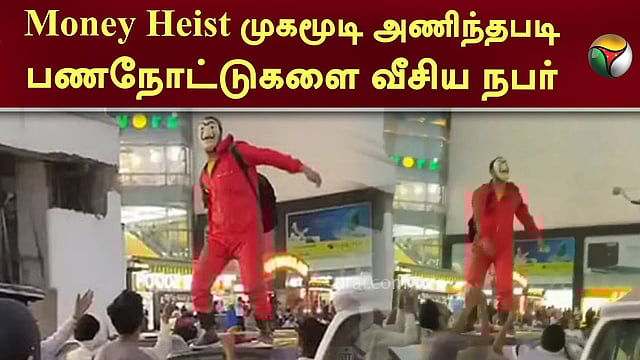 ராஜஸ்தான் மாநிலம் ஜெய்ப்பூரில், Money Heist முகமூடியை அணிந்த நபர் ஒருவர், பணநோட்டுகளை வீசி எறியும் காட்சிகள் வெளியாகி உள்ளன. சாலையின் நடுவே காரை நிறுத்திவைத்துவிட்டு, அதன்மீது ஏறிநின்று அந்த நபர் வீசிய ரூபாய் நோட்டுக்களை, அங்கிருந்த மக்கள் கீழிருந்து முண்டியடித்தபடி எடுத்தனர்.