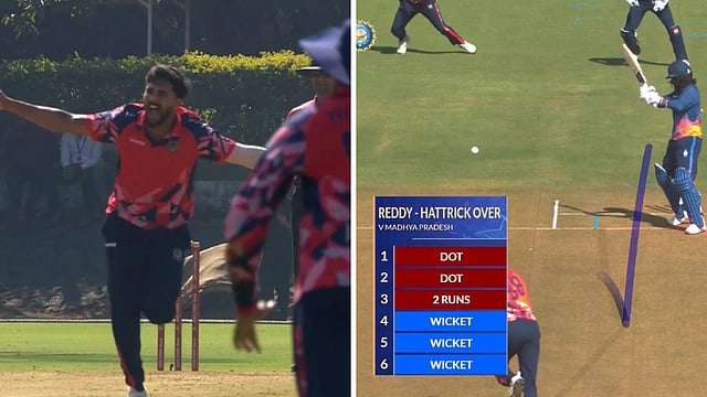 சையத் முஷ்டாக் அலி டிராபியில், மத்திய பிரதேச அணிக்கு எதிராக ஆந்திரா அணியின் நிதிஷ் குமார் ரெட்டி ஹாட்ரிக் விக்கெட்டை வீழ்த்தி அசத்தியுள்ளார். 113 ரன்கள் இலக்குடன் களமிறங்கிய மத்திய பிரதேச அணிக்கு, 3வது ஓவரில் தொடக்க வீரர் ஹர்ஷ் கவாலி, ஹர்ப்ரீத் சிங் மற்றும் கேப்டன் ரஜத் பட்டிதார் ஆகியோரின் விக்கெட்டுகளை வீழ்த்தி அதிர்ச்சி கொடுத்தார்.