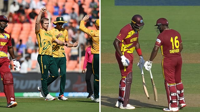 அகமதாபாத்தில் பரபரப்பாக நடைபெற்ற போட்டியில் டாஸ் வென்ற தென்னாப்பிரிக்கா அணி பந்துவீச்சை தேர்வுசெய்தது. அதன்படி முதலில் பேட்டிங் செய்த வெஸ்ட் இண்டீஸ் அணி முதலிரண்டு ஓவரில் 29 ரன்களை குவித்து மிரட்டலாக தொடங்கியது.