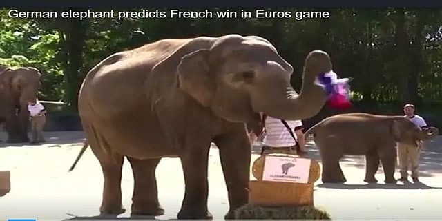 விளையாட்டு போட்டிகளில் எந்த அணி வெல்லும் என்பதை விலங்குகளை கொண்டு கணிப்பது மேற்கத்திய நாடுகளில் பிரபலமாக இருந்து வருகிறது. இந்நிலையில் ஜெர்மனி - பிரான்ஸ் அணிகள் மோதும் போட்டியில் வெல்வது யார் என யசோதா என்ற 41 வயது யானையை கொண்டு கணிக்கப்பட்டது. வெள்ளிப் பெட்டி ஒன்றில் ஜெர்மனி, பிரான்ஸ் நாட்டு கொடிகள் வைக்கப்பட்டிருந்தன. இதில் பிரான்சின் கொடியை யானை எடுத்ததால் அந்த அணியே வெல்லும் என கணிக்கப்பட்டுள்ளது.