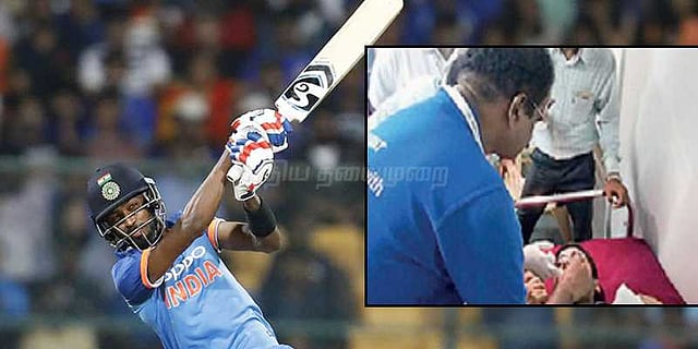 இந்திய அணி பேட்டிங் செய்தபோது, ஆஸ்திரேலிய சுழற்பந்துவீச்சாளர் ஜூம்பா வீசிய பந்தை சிக்சருக்கு தூக்குவதில் அதிக ஆர்வம் காட்டினார் பாண்ட்யா. இதனால் ரசிகர்கள் உற்சாகமடைந்தனர். அப்படி பறந்து வந்து ஒரு சிக்சர் பந்து, விளையாட்டைப் பார்த்துக்கொண்டிருந்த, டோசிட் அகர்வால் (24) என்ற ரசிகரின் உதட்டைப் பதம் பார்த்தது. ரத்தம் கொட்டியதை அடுத்து, மைதானத்தில் இருந்து அவர் அருகில் இருந்த ஹாஸ்மட் என்ற மருத்துவமனைக்கு அழைத்துச் செல்லப்பட்டார். பரிசோதித்த டாக்டர் அஜீத் பெனடிக்ட், அவருக்கு தையல்கள் போட்டார்.