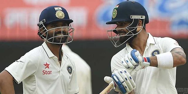 இந்நிலையில்தான், விராட் கோலியும், ரகானேவும் ஜோடி சேர்ந்து நிதானமான ஆட்டத்தை வெளிப்படுத்தினர். நிதானகாக விளையாடினாலும் அவ்வவ்போது பவுண்டரிகளை அடிக்கவும் தவறவில்லை. முதலில் விராட் கோலியை காட்டிலும் ரகானே தான் வேகமாக ரன் சேர்த்தார். ஆனால், பின்னால் விராட் கோலி தான் முதலில் அரைசதம் அடித்தார். விராட் கோலி 74 பந்திலும், அவரை தொடர்ந்து ரகானே 76 பந்திலும் அரைசதம் அடித்தனர். இதனால், 41.3 ஓவரில் 150 ரன், 59 ஓவரில் 200 ரன்களையும் இந்திய அணி எட்டியது.