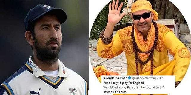 இங்கிலாந்து அணிக்கு எதிரான இரண்டாவது டெஸ்ட் போட்டியில் புஜாரா விளையாடுவது குறித்து சேவாக் நகைச்சுவையாக ட்வீட் செய்துள்ளார்.