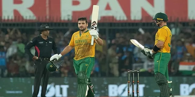 முதலில் பேட்டிங் ஆடிய தென்னாப்பிரிக்க அணியின் தொடக்க வீரரும் கேப்டனுமான டெம்பா பவுமா வெறும் 3 ரன்னில் ஆட்டமிழந்து மீண்டும் ஏமாற்றினார். அதைத்தொடர்ந்து டி காக் மற்றும் ரைலீ ரூசோ ஆகிய இருவரும் அடித்து ஆடினர். இந்திய பவுலிங்கை பவுண்டரியும் சிக்ஸருமாக விளாசி அடித்து நொறுக்கினார். அதிரடியாக ஆடி அரைசதம் அடித்த குயிண்டன் டி காக் 43 பந்தில் 68 ரன்களை குவித்து ரன் அவுட்டாகி வெளியேறினார். டிரிஸ்டான் ஸ்டப்ஸ் 23 ரன்களுக்கு ஆட்டமிழந்தார். ஆனால் சிக்ஸர் மழை பொழிந்த ரைலீ ரூசோ 48 பந்தில் சதமடித்து அசத்தினார். இது சர்வதேச டி20 போட்டிகளில் அவரின் முதல் சதமாகும். 48 பந்தில் 7 பவுண்டரிகள் மற்றும் 8 சிக்ஸர்களுடன் 100 ரன்களை குவித்து கடைசி வரை களத்தில் இருந்தார் ரூசோ.