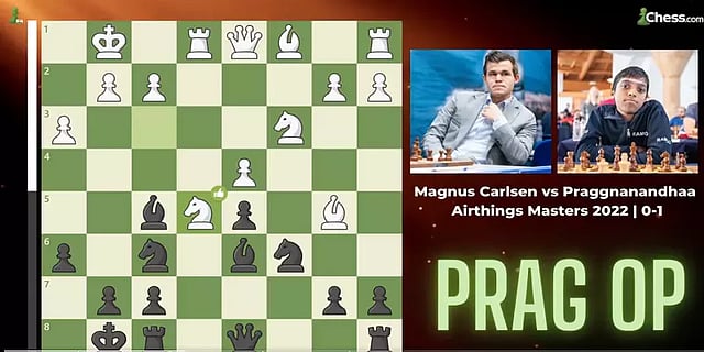 ஏர்திங்ஸ் மாஸ்டர்ஸ் ரேபிட் செஸ் போட்டி, ஆன்லைன் வாயிலாக நடைபெற்று வருகிறது. 16 வீரர்கள் இதில் பங்கேற்றனர். எட்டாவது சுற்றில் சென்னையைச் சேர்ந்த இளம் கிராண்ட் மாஸ்டரான பிரக்ஞானந்தா, உலகச் சாம்பியனும், நம்பர் ஒன் வீரருமான நார்வேயின் மேக்னஸ் கார்ல்சனை எதிர்கொண்டார்.