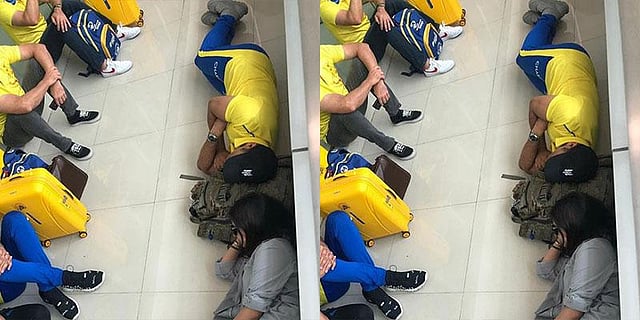 விமான நிலையத்தின் காத்திருப்பு அறையில் தோனியும், அவரது மனைவியும் தரையில் படுத்திருப்பது போன்ற படம் சமூக வலைத்தளங்களில் அவரது ரசிகர்களால் பகிரப்பட்டு வருகிறது.