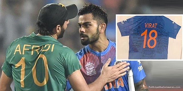 பாகிஸ்தான் கிரிக்கெட் அணியின் ஆல்ரவுண்டரான சாகித் அப்ரிதி (47), சர்வதேச கிரிக்கெட்டில் இருந்து ஓய்வுபெறுவதாக கடந்த பிப்ரவரி மாதம் அறிவித்தார். அவரை கவுரவிக்க இந்திய கிரிக்கெட் அணி முடிவு செய்தது. இதையடுத்து இந்திய கிரிக்கெட் அணி கேப்டன் விராத் கோலி அணிந்துகொள்ளும் 18 என்ற எண்ணைக் கொண்ட ஜெர்சியை அவருக்கு வழங்க முடிவு செய்தனர். இதில் இந்திய கிரிக்கெட் அணி வீரர்கள் கோலி, யுவராஜ் சிங், ஆஷிஷ் நெஹ்ரா, சுரேஷ் ரெய்னா, பும்ரா, பவன் நேகி, ஜடேஜா, புவனேஸ்வர் குமார், ரஹானே, தாவன், அஸ்வின், பயிற்சியாளர் ரவிசாஸ்த்ரி உட்பட பலர் கையெழுத்திட்டிருந்தனர். அதில், ‘உங்களுக்கு எதிராக விருப்பதுடனேயே எப்போதும் விளையாடினோம்’ என்று கோலி எழுதியிருந்தார்.