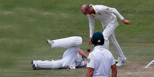 ஆஸ்திரேலிய கிரிக்கெட் அணி, தென்னாப்பிரிக்காவில் சுற்றுப்பயணம் செய்து விளையாடி வருகிறது. டர்பனில் நடந்த முதல் போட்டியில் ஆஸ்திரேலிய அணி நேற்று வெற்றிபெற்றது. இந்தப் போட்டியின் இரண்டாவது இன்னிங்ஸில் தென்னாப்பிரிக்க வீரர் டிவில்லியர்ஸ் ரன் அவுட் ஆனார். அவரை ரன் அவுட் ஆக்கிய ஆஸ்திரேலிய சுழற்பந்துவீச்சாளர் நாதன் லயன் அந்த பந்தை அவர் மீது எறிந்தார். இது டிவியில் அடிக்கடி காண்பிக்கப்பட்டது.