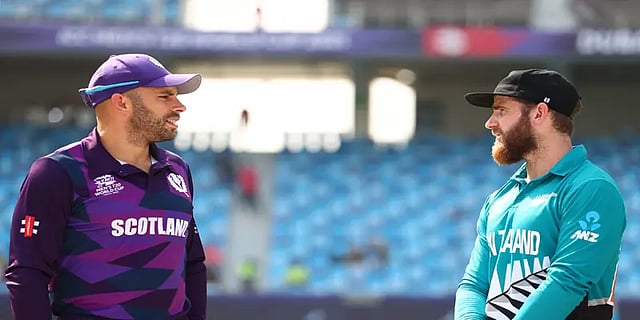 துபாயில் நடைபெற்ற போட்டியில் முதலில் பேட்டிங் செய்த நியூசிலாந்து அணி 5 விக்கெட் இழப்புக்கு 172 ரன்கள் குவித்தது. சிறப்பான ஆட்டத்தை வெளிப்படுத்தி ரன்களை குவித்த தொடக்க வீரர் மார்ட்டின் கப்தில் சதமடிக்கும் வாய்ப்பை தவறவிட்டார். 93 ரன்களில் அவர் விக்கெட்டை பறிகொடுத்தார். ஸ்காட்லாந்து தரப்பில் சஃபியான் ஷரிப், ப்ராட் வீல் ஆகியோர் தலா 2 விக்கெட்டுகள் வீழ்த்தினர்.