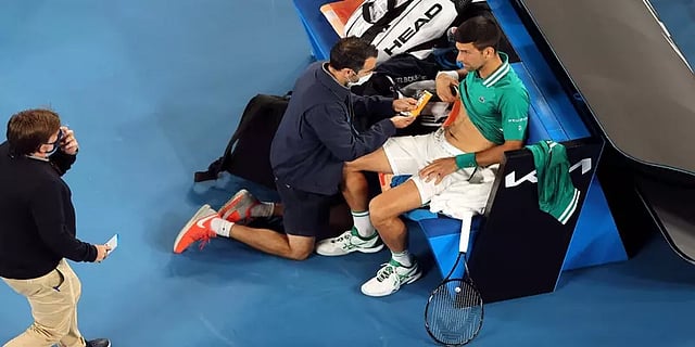 ஆஸ்திரேலிய ஓபன் டென்னிஸ் போட்டியில் தசைப்பிடிப்பு காரணமாக செர்பியாவின் நோவாக் ஜோகாவிச் தொடர்ந்து விளையாடுவதில் சிக்கல் ஏற்பட்டுள்ளது.
