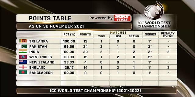 இந்திய அணி 2021 - 23 உலக டெஸ்ட் சாம்பியன்ஷிப்பில் இதுவரை 2 வெற்றி, 1 தோல்வி, 2 போட்டிகளில் டிரா செய்துள்ளது. அதன் மூலம் 50 சதவிகித புள்ளிகளை வென்று புள்ளிப்பட்டியலில் மூன்றாம் இடத்தில் உள்ளது. அதிலும் இரண்டு ஓவர்கள் நிதானமாக பந்து வீசிய காரணத்தினால் 2 புள்ளிகளை இழந்துள்ளது இந்தியா.