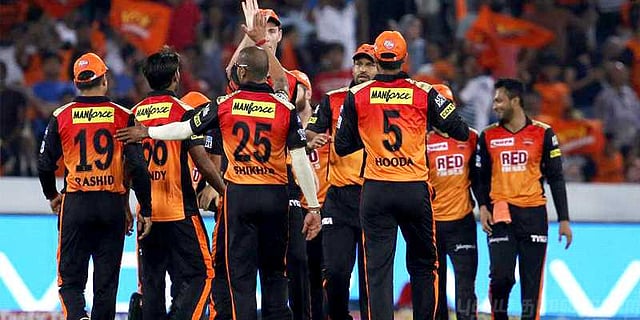 பின்னர் களமிறங்கிய ஐதராபாத் அணி, தொடக்கத்திலேயே அதிரடி காட்டியது. சஹாவும் ஷிகர் தவானும் அடித்து ஆடினர். இவர்கள் இருவரையும் இளம் சுழல் மார்க்கண்டே, வீழ்த்தினார். சஹா 22 ரன்களும் தவான் 28 பந்துகளில் 45 ரன்களும் எடுத்தனர். அடுத்து வந்த மனீஷ் பாண்டே (11 ரன்) ஷாகிப் அல் ஹசன் (12) ஆகியோரின் விக்கெட்டையும் மார்க்கண்டே வீழ்த்த அந்த அணி தடுமாறியது.
