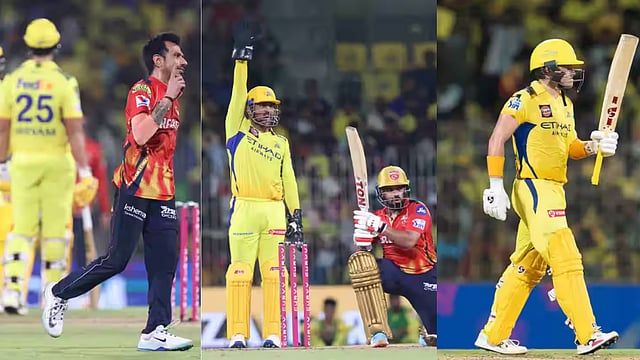 பின்னர் வந்த கேப்டன் தோனி முதல் பந்திலே ஒரு பவுண்டரி விளாசினார். தோனியின் அதிரடியை எப்படியாவது கட்டுப்படுத்தலாம் என்று நினைத்த ஸ்ரேயாஸ் ஐயர் 19 ஆவது ஓவரை ஸ்பின்னரான சாஹலுக்கு கொடுத்தார். அதற்கு கையில் பலனும் கிடைத்தது. முதல் பந்தில் சிக்ஸர் விளாசிய தோனி மீண்டும் ஒரு சிக்ஸர் விளாச முயன்று எல்லைக்கோட்டில் கேட்ச் ஆகி ஆட்டமிழந்தார். கடைசி 2 ஓவர்களில் சிக்ஸர் மழை பொழிவார் என்று ரசிகர்கள் ஆவலுடன் எதிர்பார்த்த நிலையில், 11 ரன்களில் ஆட்டமிழந்து ஏமாற்றினார் தோனி. அத்தோடு அந்த ஓவரில் அதிர்ச்சி முடியவில்லை. அந்த ஓவரில் மற்றொரு சோகமும் நடந்தது . அடுத்து களமிறங்கிய தீபக் ஹூடா முதல் பந்தில் 2 ரன்கள் எடுக்க, அடுத்த பந்திலேயே கேட்ச் கொடுத்து ஆட்டமிழந்தார். பின்னர் வந்த காம்போஜ் மற்றும் நூர் அடுத்தடுத்த பந்துகளில் ஆட்டமிழக்க, சாஹலுக்கு ஹாட்ரிக் விக்கெட் கிடைத்தது. அந்த ஓவரில் மொத்தம் 4 விக்கெட்டுகள் சரிந்து திருப்பு முனையாக அமைந்தது. கடைசி ஓவரிலாவது துபே ரன்கள் குவிப்பார் என்று எதிர்பார்த்தால் முதல் பந்தில் பவுண்டரி விளாசி அடுத்த பந்திலே ஆட்டமிழந்து அவரும் ஏமாற்றம் அளித்தார். 220 ரன்கள் வரை எடுக்க வாய்ப்பிருந்த நிலையில் சென்னை அணியால் 200 ரன்களை எட்ட முடியாதது சோகத்திலும் சோகம்.