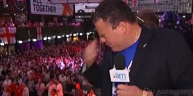 இங்கிலாந்து தோல்வியை தழுவ அந்நாட்டு ரசிகர்களின் மனநிலையைப் பற்றி நேரலையில் பேசிக் கொண்டிருந்தார். அப்போது செய்தியாளரை நோக்கி கோபமாக வந்த இங்கிலாந்து ரசிகர் ஒருவர் தன் கைகளில் கிளாசில் இருந்த பீரை அவர் மீது ஊற்றினார். செய்தியாளர் இதனை எதிர்பார்க்கவேயில்லை. இருப்பினும், அதனை துடைத்துக் கொண்டு தொடர்ந்து நேரலையில் பேசினார்.