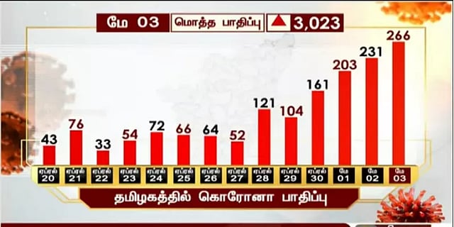 தமிழகத்தில் நாள்தோறும் கொரோனா வைரஸ் தொடர்பான அறிவிப்புகளை சுகாதாரத்துறை வெளியிட்டு வருகிறது. அந்த வகையில் இன்று வெளியிடப்பட்டுள்ள தகவலின் படி தமிழகத்தில் 266 பேருக்கு கொரோனா வைரஸ் உறுதி செய்யப்பட்டுள்ளது. இதனால் தமிழகத்தில் கொரோனா வைரஸால் பாதிக்கப்பட்டோரின் எண்ணிக்கை 3023 ஆக அதிகரித்துள்ளது.