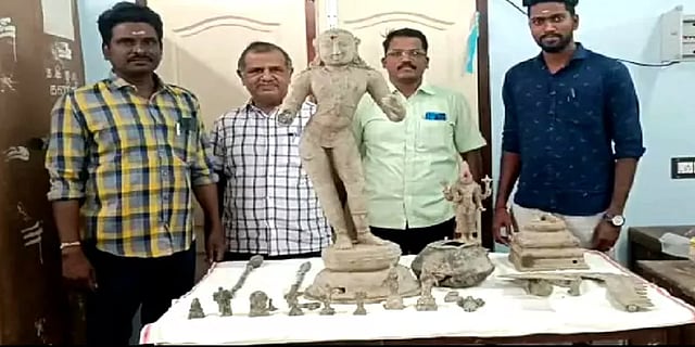 இந்த நிலையில், தோண்டப்பட்ட குழிக்குள் சுமார் 3 அடி உயரம் கொண்ட பெருமாள் சிலை, 1 அடி உயரமுள்ள அப்பர் சிலை மற்றும் சிறிய வகை சிலைகள் அடங்கிய உலோக கலையமும் கிடைத்துள்ளன.