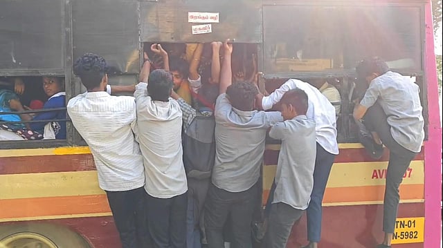 அளவுக்கு அதிகமான மாணவர்கள் பயணிப்பதால் பேருந்து ஒரு புறமாக சாய்ந்துபடி செல்கிறது. இதனால் மாணவர்கள் விபத்தில் சிக்கும் அபாயம் உருவாகி உள்ளது. எனவே போக்குவரத்துத் துறை இந்த வழித்தடத்தில் அதிகப்படியான பேருந்துகளை இயக்க வேண்டும் என மாணவர்கள் கோரிக்கை விடுத்துள்ளனர்