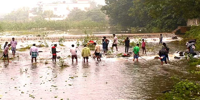 மழை பாதிப்பால் பொதுமக்கள் அவதிப்பட்டு வரும் நிலையில், தங்களது கவலையை மறக்க இளைஞர்கள் ஆனந்தமாய் மீன்களை வேட்டையாடி வரும் நிகழ்வு ரசிக்கும்படியாக உள்ளது.