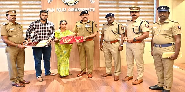அதை அங்கிருந்த வீட்டின் நபர் ஒருவர் எடுத்து வைத்து யாரெனும் வருகிறார்களா என பார்த்து கொண்டிருந்தார். அதற்குள் போலீசார் துரிதமாக செயல்பட்டு அந்த இடத்திற்கு விரைந்து சென்று அவரிடம் இருந்து 40 பவுன் தங்க நகைகளை மீட்டனர். பின்னர், ஆவடி காவல் ஆணையர் சந்தீப்ராய் ரத்தோர் மூலமாக, அன்பழகி மற்றும் அவரது மகன் ஹரிசங்கர் ஆகியோரை நேற்று ஆவடி ஆணையரகத்திற்கு அழைத்து ஒப்படைத்தனர்.