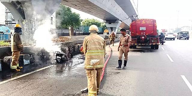 சென்னை குரோம்பேட்டை, ஜி.எஸ்.டி.சாலை, சைதன்யா பள்ளி எதிரே சாலையில் சென்று கொண்டிருந்த இருசக்கர வாகனம் திடீரென தீப்பற்றி எரிந்தது. தகவலறிந்து விரைந்து வந்த தாம்பரம் தீயணைப்புத் துறை வீரர்கள் தீயை அணைத்தனர்.