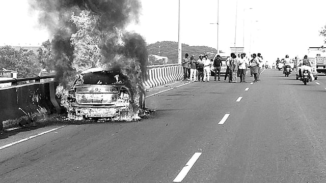 அப்போது காரின் முன் பகுதியில் இருந்து திடீரென புகை வந்துள்ளது. இதையடுத்து காரை சாலையில் ஓரமாக நிறுத்திவிட்டு இறங்கிய சிறிது நேரத்தில் கார் தீப்பிடித்து எரிய ஆரம்பித்தது. இதனால் அதிர்ச்சி அடைந்த அவர், தீயணைப்புத் துறையினருக்கு தகவல் தெரிவித்தார். தகவல் அறிந்து தாம்பரத்தில் இருந்து வந்த தீயணைப்பு வீரர்கள் தண்ணீர் ஊற்றி தீயை அணைத்தனர்.