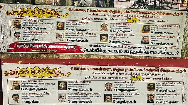 இந்நிலையில் “கொலை, கொள்ளை, சமூக நல்லிணக்கத்தை சீர்குலைத்தல் உள்ளிட்ட கடும் குற்ற வழக்குகளை சந்தித்து வரும் 34 மத்திய அமைச்சர்களை பதவியிலிருந்து விலக்கச் சொல்லி டெல்லிக்கு கடிதம் எழுதுவீங்களா கிண்டி?” என தமிழக ஆளுநரை கேள்வி கேட்டு திமுக தொண்டரும் வழக்கறிஞருமான ஹேமந்த் அண்ணாதுரை என்பவர், சென்னை முழுவதும் போஸ்டரை அடித்து ஒட்டியுள்ளார்.