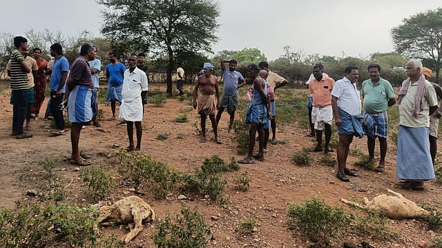 ஈரோடு மாவட்டம் சென்னிமலை அருகே கொடுமணல் பனங்காட்டைச் சேர்ந்த விவசாயி விஜயகுமார் 20க்கும் மேற்பட்ட செம்மறி ஆடுகளை வளர்த்து வருகிறார். நேற்று இரவு வழக்கம் போல பட்டியில் ஆடுகளை அடைத்துவிட்டு இன்று காலை மேய்ச்சலுக்கு திறந்து விடச் சென்றுள்ளார். அப்போது ஆடுகள் ஆங்காங்கே உயிரிழுந்து கிடந்ததைக் கண்டு அதிர்ச்சி அடைந்து அவர், பட்டியில் சென்று பார்த்துள்ளார்.