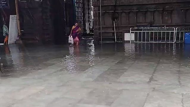 அது மட்டுமல்லாமல் கோவிலின் மேல்தளத்தில் இருந்து விழுந்த தண்ணீர் , பிரகார பாதை முழுவதும் தேங்கியுள்ளது.ன நுழைவாயில் மற்றும் கோவிலை சுற்றி தேங்கி நிற்கும் மழை நீரில் பக்தர்கள் மிகவும் சிரமப்பட்டு நடந்து செல்ல வேண்டிய அவல நிலை ஏற்பட்டுள்ளது. இதேபோல் கோவிலின் அனைத்துப் பகுதிகளிலும் மழைநீர் வெளியேற வழியின்றி தேங்கி நிற்பதால் மழை நீரை வாடிகால் வழியாக வெளியேற்றுமாறு பக்தர்கள் வேண்டுகோள் விடுத்துள்ளனர்.