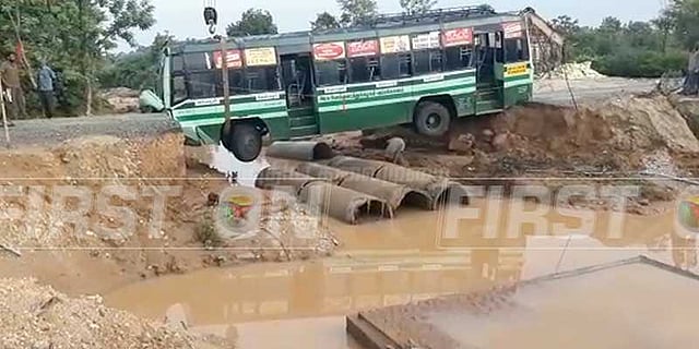 அரியலூர் மாவட்டம் செந்துறை - ஆர்.எஸ். மாத்தூர் சாலையிலுள்ள தற்காலிக பாலம் வெள்ளத்தில் அடித்துச்சென்றதில் அரசு பேருந்து சிக்கிக்கொண்டது.