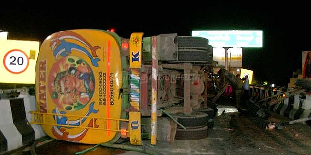 சென்னை கிண்டி அருகே கத்திபாரா மேம்பாலத்தில் சென்று கொண்டிருந்த தண்ணீர் லாரி கட்டுப்பாட்டை இழந்து கவிழ்ந்து விபத்துக்குள்ளானது. இந்த விபத்தில் அதிர்ஷ்டவசமாக லாரி ஓட்டுநர் பாலு உயிர் தப்பினார். இதனால் அப்பகுதியில் போக்குவரத்து பாதிக்கப்பட்டது