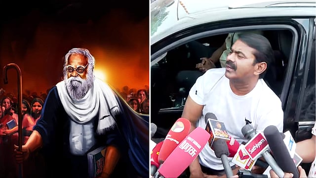 பெரியார்தான் அறிஞர் அண்ணாவை படிக்க வைத்தாரா? எங்களைப் படிக்க வைத்தது காமராஜர். குடிக்க வைத்தது திராவிடம். பெரியார் எந்த மதத்திற்கு எதிரான குறியீடு? பெரியாரின் பரிணாம வளர்ச்சிதான் திமுக. பெரியாரின் பெருமைமிக்க பெண்ணியம் குறித்து கொஞ்சம் பேச சொல்லுங்கள். தள்ளாடிக்கொண்டு தளர்ச்சி பெற்றுக் கொண்டிருக்கிறது திராவிடம். பேரெழுச்சி பெற்றிருக்கிறது தமிழ் தேசிய அரசியல்.. மோதிக் கொண்டு இருக்காதீர்கள்!” என்று பேசியிருக்கிறார்.