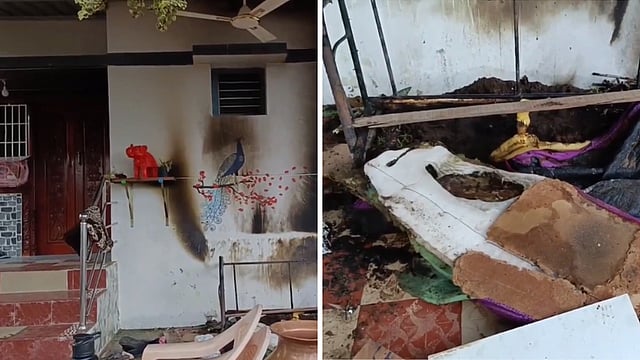 இதில் வீட்டில் முன்பி வைக்கப்பட்டிருந்த சோபா, ஜன்னல் மற்றும் கதவு ஆகியவை எரிந்து சேதம் அடைந்துள்ளது. இதில் யாருக்கும் காயம் ஏற்படவில்லை என போலீசார் தெரிவித்துள்ளனர்.