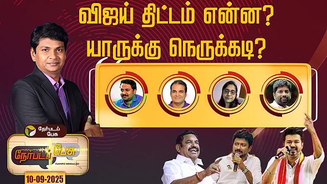 இன்றைய நேர்ப்பட பேசு நிகழ்ச்சியில், “ஏற்கனவே சுற்றுப்பயணத்தில் பழனிசாமி, உதயநிதி.. அடுத்து தமிழகத்தை சுற்றி வரவுள்ள விஜய்.. விஜய் திட்டம் என்ன? யாருக்கு நெருக்கடி? ” எனும் தலைப்பில் விவாதிக்கப்பட்டது.