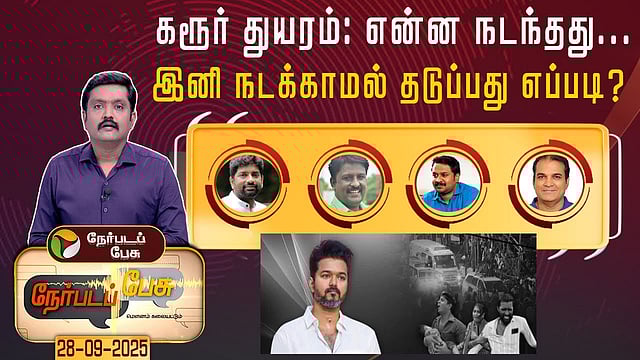 இன்றைய நேர்ப்பட பேசு நிகழ்ச்சியில், "விஜய் கூட்ட நெரிசலில் 40 பேர் பலியான கொடுமை... கரூர் துயரம்: என்ன நடந்தது? இனி நடக்காமல் தடுப்பது எப்படி?" எனும் தலைப்பில் விவாதிக்கப்பட்டது.