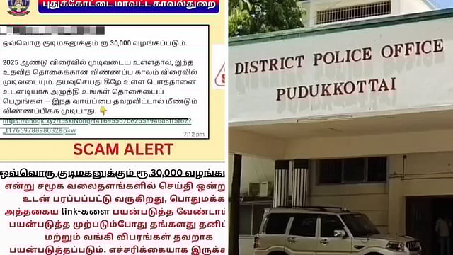 புதுக்கோட்டை மக்களுக்கு 30,000 ரூபாய் வழங்கப்படும் என சமூக வலைதளங்களில் பரவும் போலி விளம்பரத்தால், காவல்துறை எச்சரிக்கை விடுத்துள்ளது. பொதுமக்கள் அந்த லிங்கை பயன்படுத்த வேண்டாம் எனவும், தனிப்பட்ட மற்றும் வங்கி விவரங்கள் தவறாக பயன்படுத்தப்படலாம் எனவும் எச்சரிக்கப்பட்டுள்ளனர்.