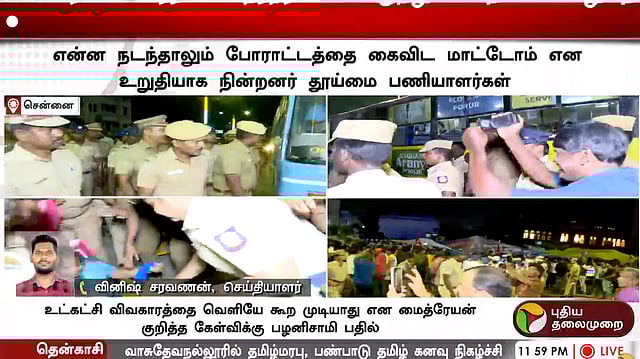 சென்னையில் 13 நாட்களாக போராட்டத்தில் ஈடுபட்ட தூய்மைப் பணியாளர்களைக் குண்டுக்கட்டாக கைது செய்துள்ளது தமிழக காவல்துறை.