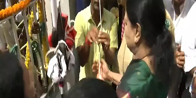 அதிமுக தனது 50வது ஆண்டில் அடியெடுத்து வைக்கிறது. இதை தமிழகம் முழுவதும் பொன்விழா ஆண்டாக அக்கட்சியினர் கொண்டாடி வருகின்றனர். இந்நிலையில் சென்னை தியாகராய நகரில் உள்ள எம்.ஜி.ஆர் நினைவிடத்திற்கு சென்ற சசிகலா அங்கு அதிமுக கொடியை ஏற்றி வைத்தார்.
